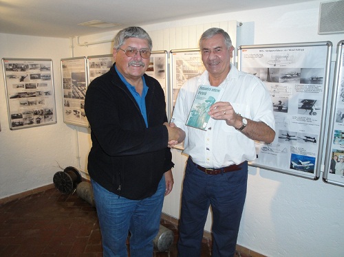 Der Vorsitzende der Kameradschaft Bad Reichenhall im Kameradenkreis der Gebirgstruppe, Manfred Held (rechts) bedankte sich bei Fredric Müller-Romminger für die informative und spannende Führung durch das Museum des ehemaligen „Regierungsflugplatzes Reichenhall–Berchtesgaden“ mit einem passenden Geschenk.