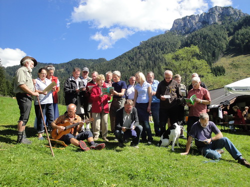 Seit 26 Jahren gibt es nun den Bad Reichenhaller Soldatenchor „Wir Jager lassen schallen“. Das Anliegen der beiden „Gründerväter“, Heinz Karczewski und Hilmar Harbke war es damals, das Liedergut der Soldaten – in erster Linie das der Gebirgsjäger - zu erhalten und der nachfolgenden Generation weiter zu geben. Mittlerweile wurden mehrere Liederbücher verfasst und auch eine CD herausgegeben, die innerhalb kürzester Zeit vergriffen war. Jetzt fand das Liedgut des Chores eine Ergänzung. Der Grund dafür ist die Tatsache, dass sich der Soldatenchor seit einiger Zeit einmal im Jahr auf der Ruhpoldinger „Dandl Alm“ im Röthelmoosgebiet zu einem Almsingen trifft – heuer zum fünften Mal. Dieses kleine Jubiläum war für Hilmar Harbke (links) der Anlass, zur Melodie „Mein Land Tirol“ einen Text zu schreiben, der eine Hommage an die Alm und die Schönheit des Almgebietes ist. Dies wird schon in der ersten Strophe ausgedrückt, denn da heißt es zum Beispiel: „Umringt von Bergen stolz und hoch erhoben, liegt in der Heimat unsre Dandl Alm“. Die neue „Röthelmooshymne“ wurde kürzlich beim Almsingen zur Überraschung der Almbesitzerin Scarlett Haßlberger (2.v.links) uraufgeführt, musikalisch begleitet von Heinz Karczewski mit seiner Gitarre. In der Folge bewies dann auch in diesem Jahr der Chor mit seinen schönen Stimmen, dass die Kameraden das gesamte Repertoire der überlieferten Soldaten- und Volkslieder beherrscht. Und dass die singenden ehemaligen Gebirgsjäger sicher wieder auf die „Dandl Alm“ zurückkehren, steht auf jeden Fall jetzt schon fest; denn wie heißt es im Refrain des Liedes: „Du bist die Alm, der wir die Treue halten, weil du so schön bist, unsre Dandl Alm“. hab |