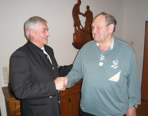 Bildbeschreibung: Der Vorsitzende Manfred Held zeichnete im Rahmen der Jahreshauptversammlung Josef Fischer für seine Verdienste um die Kameradschaft Bad Reichenhall mit dem „Abzeichen mit Lorbeerkranz“ aus.